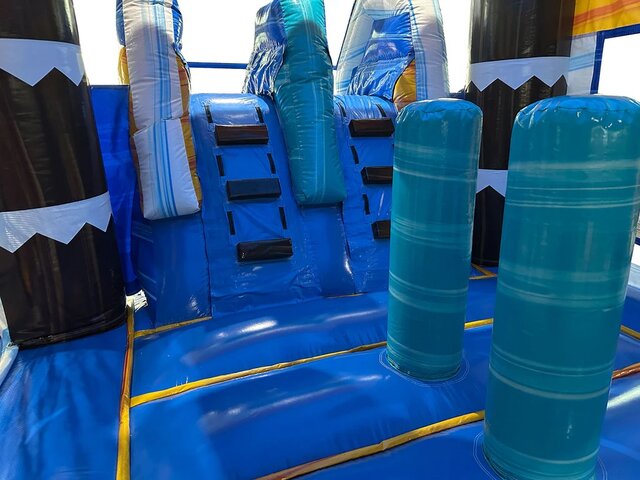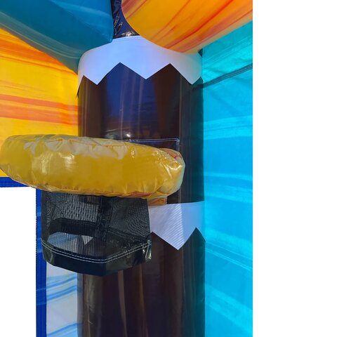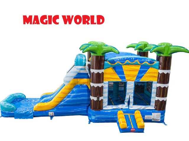 Turn your party into a tropical island adventure with the Palm Splash Combo with Double Slide from Magic World! Towering palm trees and bright island colors set the scene for hours of non-stop excitement. Kids can jump and bounce in the spacious bounce house, weave through the fun punch pillars, and show off their skills with the built-in basketball hoop before climbing up for the main event — the exciting double racing slide!