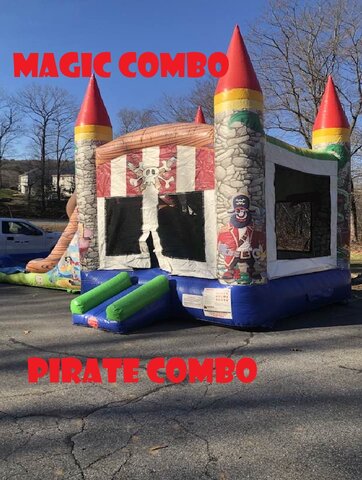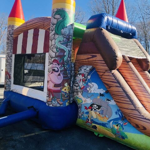 Ahoy Matey! Get ready to set sail on a swashbuckling adventure with our Pirate Combo Bounce House with Double Slide! This exciting inflatable is packed with pirate fun and action from bow to stern.